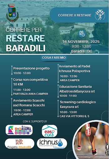Si corre. E lo possono fare anche le persone diversamente abili. Partirà domenica 16 dicembre dal paese più piccolo della Sardegna l’evento “10 km nei 10 paesi più piccoli della Sardegna – Correre per restare”, realizzato dall’Associazione AlbatroSS in collaborazione con l’Associazione Easy Cura e con il patrocinio del Comune di Baradili.