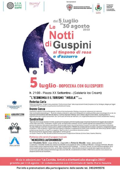 Prende il via mercoledì 5 luglio alle 21 in piazza XX Settembre, spazio gelateria Ice Cream, l’edizione 2023 delle “Notti di guspini si tingono di rosa e azzurro”, organizzata dal Centro Commerciale Naturale Guspini, in collaborazione con Proloco, Comune, Regione Autonoma della Sardegna e Associazioni cittadine. Ricco e intenso il programma che dal 5 luglio al 30 agosto animeranno le serate estive dell’ex centro minerario.