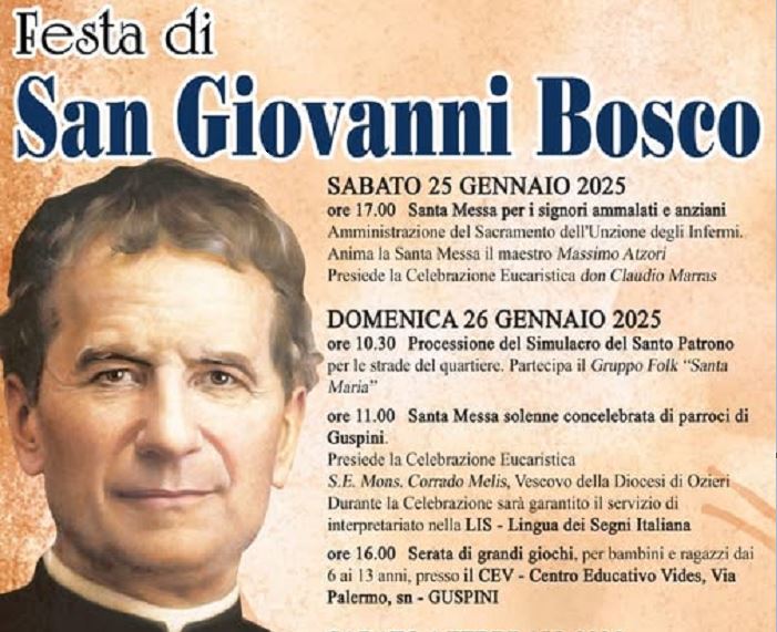 Domenica 26, dalle 10,30 si svolgerà la processione con la partecipazione del gruppo folk “Santa Maria”. A seguire, alle 11, la messa concelebrata da mons. Corrado Melis, Vescovo di Ozieri e dai parroci delle parrocchie guspinesi. Sarà presente l’interprete dell’interprete delle lingua dei segni, per dare la possibilità di seguire al meglio la celebrazione anche ai non udenti. Dalle 16, al Centro Educativo Vides, ci terranno i “Grandi Giochi”, dedicati ai bambini e ragazzi da 6 a 13 anni.